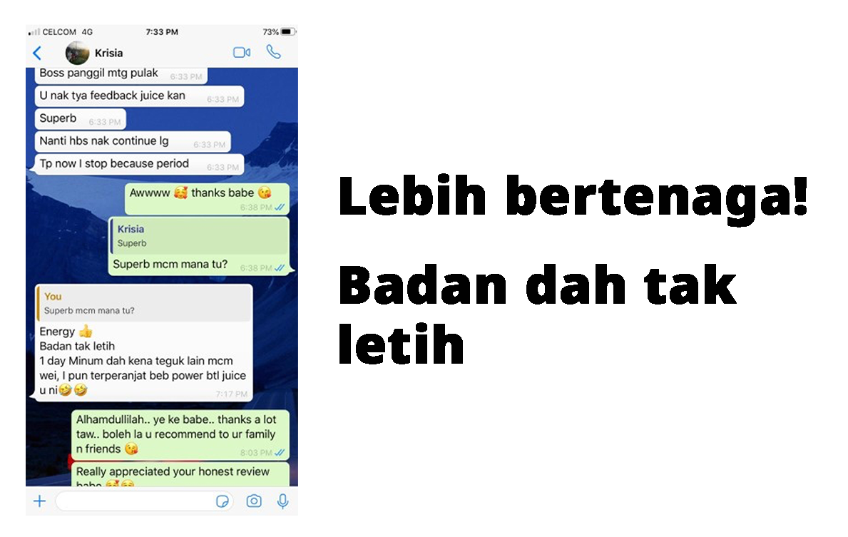 Alhamdulillah sejak mengamalkan Juzznergy, tiada lagi istilah lesu atau tidak bermaya dalam kehidupan saya. Saya boleh melakukan ibadat dengan sempurna tanpa rasa letih dan sangat bertenaga. Terima Kasih Warisan Ibu