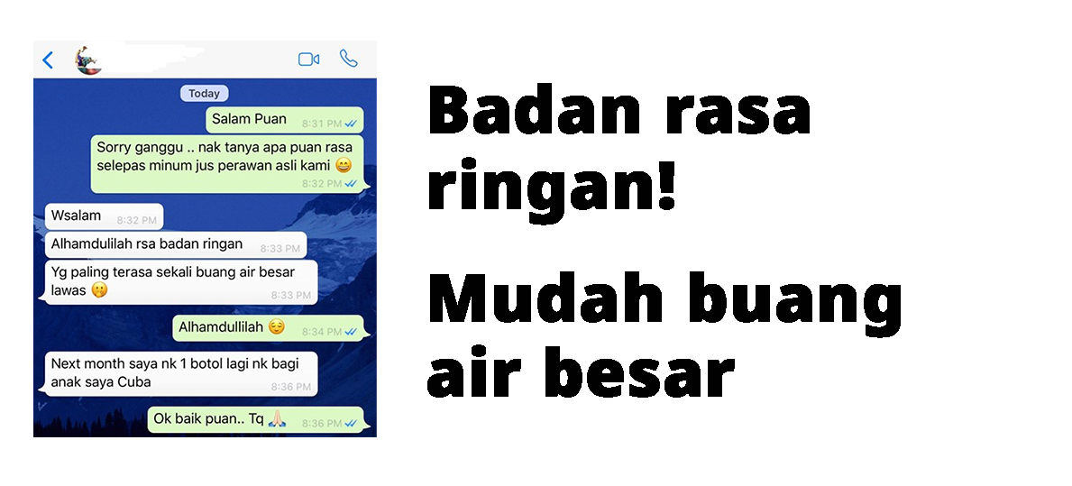 Sungai PetaniDulu saya sering dipersendakan kerana masalah bau badan yang kurang menyenangkan. Selepas rakan menyarankan agar mencuba Juzznergy Warisan Ibu ni, masalah bau badan dah tak ada lagi dan keyakinan diri saya bertambah. Terima kasih Warisan Ibu.