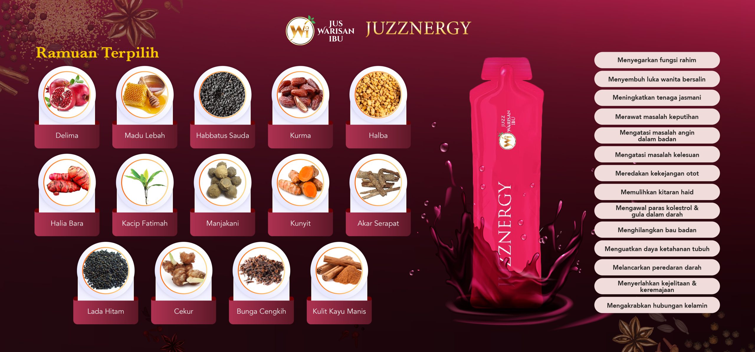 Juzznergy Warisan Ibu merupakan ramuan rempah ratus dan herba botanika yang diwarisi daripada nenek moyang.